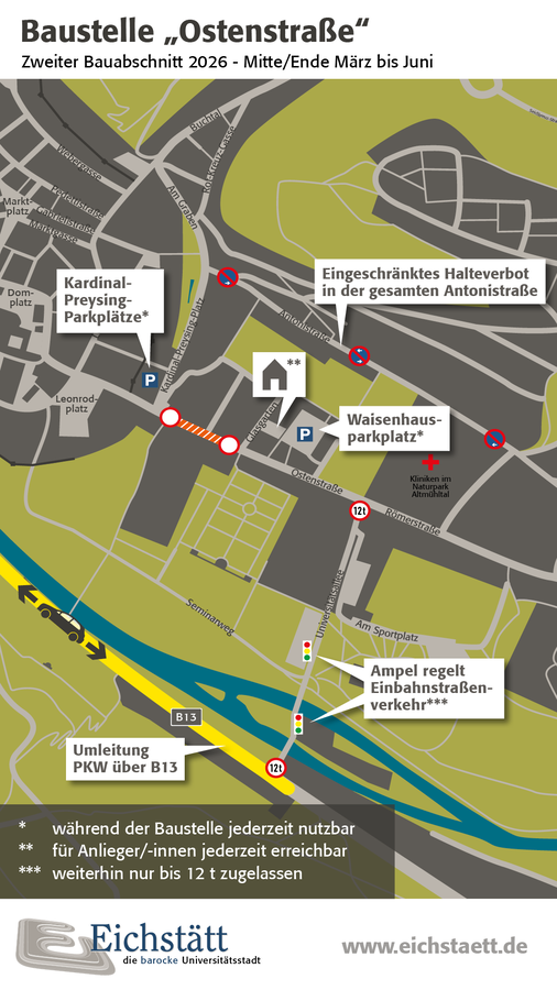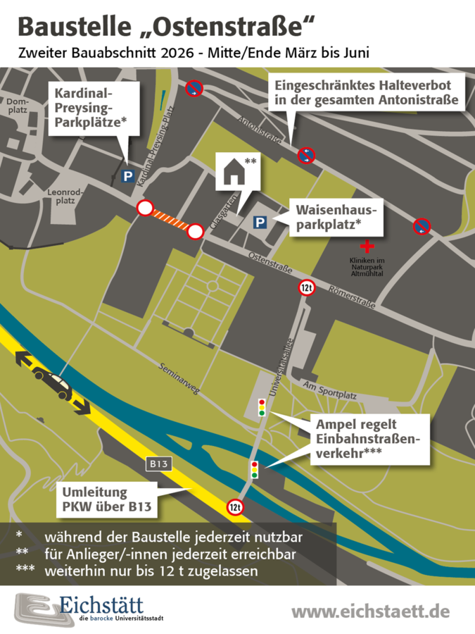 Die Stadt Eichstätt stellt hier zur Information Baustellen-Übersichtspläne zur Verfügung in verschiedenen Formaten. Diese sind explizit dafür gedacht, heruntergeladen, gespeichert und öffentlich geteilt zu werden, um möglichst viele Menschen zu informieren. Sie finden die Pläne und Informationen auch auf den Facebook- und Instagram-Kanälen der Stadtverwaltung.