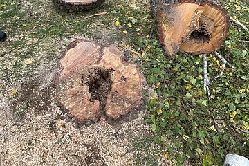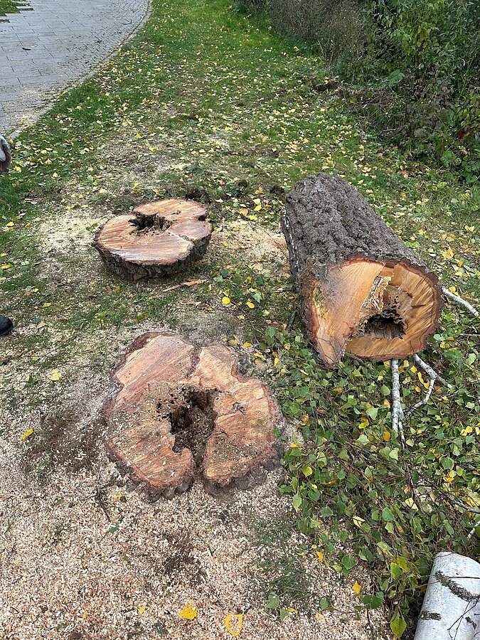 Beim Fällen haben sich die Einschätzungen der Baumgutachter und der städtischen Experten bestätigt. Beide Birken waren im Stamm bereits verfault und teilweise hohl. Damit war die Standfestigkeit überhaupt nicht mehr gegeben (siehe Foto unten).