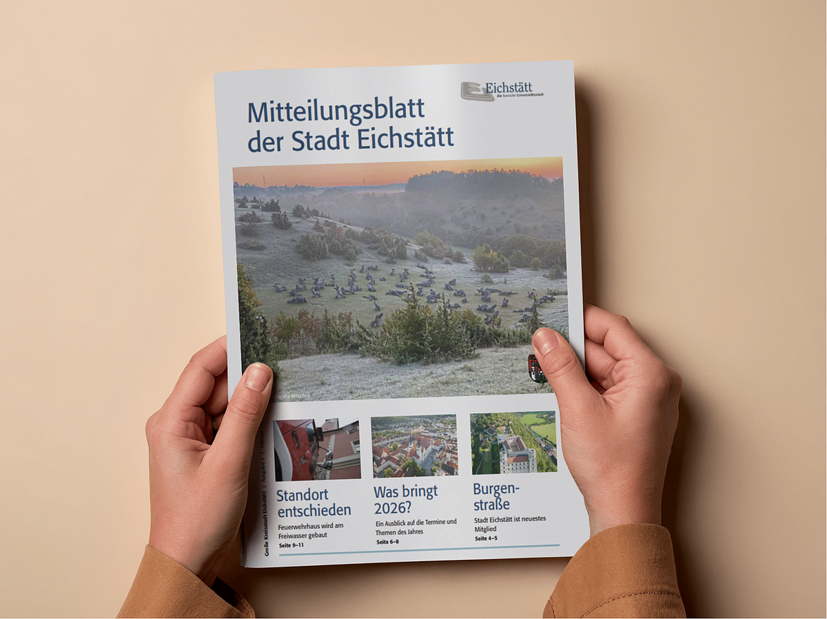 Doch natürlich ist diese erste Ausgabe des Jahres voll mit zahlreichen weiteren Themen, die in Eichstätt aktuell und interessant sind: Wir erklären, wieso Eichstätt der Neuzugang auf der Burgenstraße ist, was bei den diesjährigen Frauentagen geplant ist, wie es mit der Jugendherberge weitergeht, was das neue vhs-Semester mit sich bringt und welche Eichstätter Unternehmer/-innen aktuell eine Mietförderung der Stadt Eichstätt bekommen. Und damit Sie jetzt schon Ihr 2026 gut planen können, gibt es in diesem Mitteilungsblatt nicht nur einen Terminausblick, einen Sitzungskalender für Stadtrat und Co. und einen Veranstaltungskalender für die kommenden Wochen, sondern auch einen detaillierten Müllabfuhrkalender zum Anpinnen an die Küchentür.
