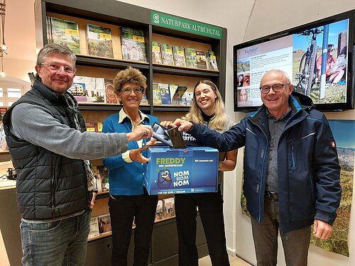 Der Hintergrund: Millionen von Handys lagern ungenutzt in Schubladen, obwohl sie wertvolle Rohstoffe wie Gold, Kupfer und seltene Erden enthalten. Mit der Aktion „Freddy Datenfresser“ setzt sich die HandyAktionBayern daher für die fachgerechte Wiederverwertung dieser Althandys ein, um Ressourcen zu schonen, für globale Rohstoffgerechtigkeit zu sorgen und gleichzeitig soziale Projekte zu unterstützen. Zugleich bietet das Projekt auch zahlreiche Bildungsmaterialien zum Globalen Lernen an. Gemeinsam mit dem Inklusionsunternehmen JuRec IT haben die Initiatoren mit ihrem neuen Sammelprojekt seit Mai dieses Jahrs ein sicheres, einfaches und nachhaltiges Handyrecycling ins Leben gerufen. An Sammelstellen in der Stadt, wie sie nun in der Tourist-Information Eichstätt eingerichtet wurde, können Althandys, Tablets und Datenträger abgegeben werden. Der Inhalt dieser Sammelboxen wird dann regelmäßig zum Dienstleistungszentrum des Landratsamts gebracht, in dem eine zentrale große „Freddy-Alu-Sammelbox“ deponiert ist, die gefahrgutkonform, verplombt und GPS-gesichert und für Handys, Smartphones und Tablets mit Akku geeignet ist. Sie erfüllt alle gesetzlichen Transport- und Sicherheitsvorgaben. Ist sie voll, wird sie durch die Firma JuRec IT abgeholt und ersetzt.