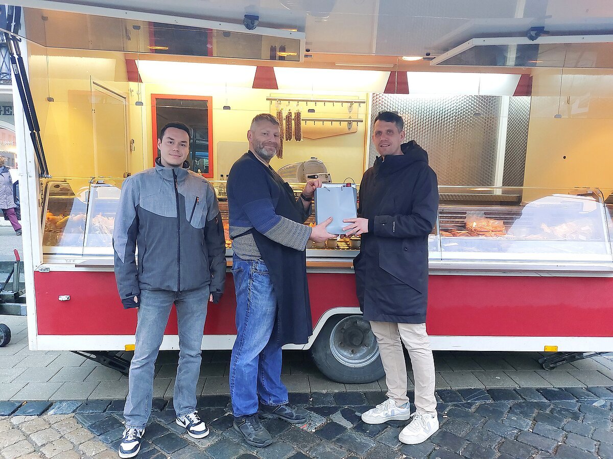 Mit einem kleinen Präsent haben Oberbürgermeister Josef Grienberger (rechts) und Ordnungsamtsleiter Christian Hufnagel (links) am Mittwochmorgen Josef Schmaußer auf dem Wochenmarkt begrüßt. Denn er ist mit seinem Verkaufswagen seiner Firma „FeuerSau Partyservice, Saubraterei und Eventgastronomie“ der Neuzugang auf dem Eichstätter Markt. Künftig verkauft der Metzgermeister aus Neumarkt immer mittwochs seine komplett selbstgemachten Wurst- und Fleischprodukte, darunter viel Wild.