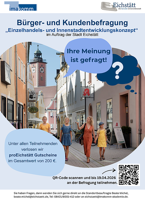Dafür gibt es vom 16. März bis zum 19. April eine digitale Befragung für alle Eichstätter und Kunden aus der Umgebung einschließlichallen, die in Eichstätt arbeiten und studieren sowie für Tourist/-innen. Nehmen Sie sich 10 - 15 Minuten Zeit und machen mit: