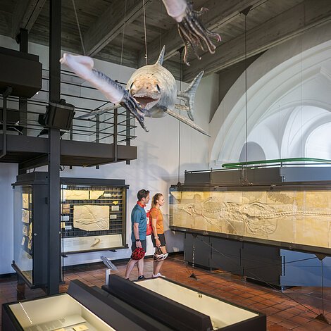 Das Jura-Museum widmet seine Ausstellung den Solnhofener Plattenkalken, die eine Fossilfundstelle von weltweiter Bedeutung sind. Das Museum zeigt und erforscht die große Vielfalt an Lebewesen, die es am und im tropischen Meer der Jurazeit vor rund 150 Millionen Jahren gab. Außergewöhnlcihe Besonderheiten wie das Original des Eichstätter Exemplars von Archaeopteryx und Juravenator, der besterhaltene Raubsaurier Deutschlands, aber auch fossile Flugsaurier, Fischsaurier, Krebse, Pfeilschwanzkrebse, Haie, Fische und viele mehr eröffnen ein Fenster in eine Vergangenheit, in der die Region ganz anders aussah. Von dieser Zeit aus, in der die Dinosaurier fliegen lernten, können Besucher viele Aspekte des Fliegens erkunden. Eine weitere Brücke zur Gegenwart schlägt der Aquarienraum mit seinen "lebenden Fossilien“ und dem größten lebenden Riff Bayerns. Regelmäßig wechselnde Sonderausstellungen ergänzen die Ausstellung.