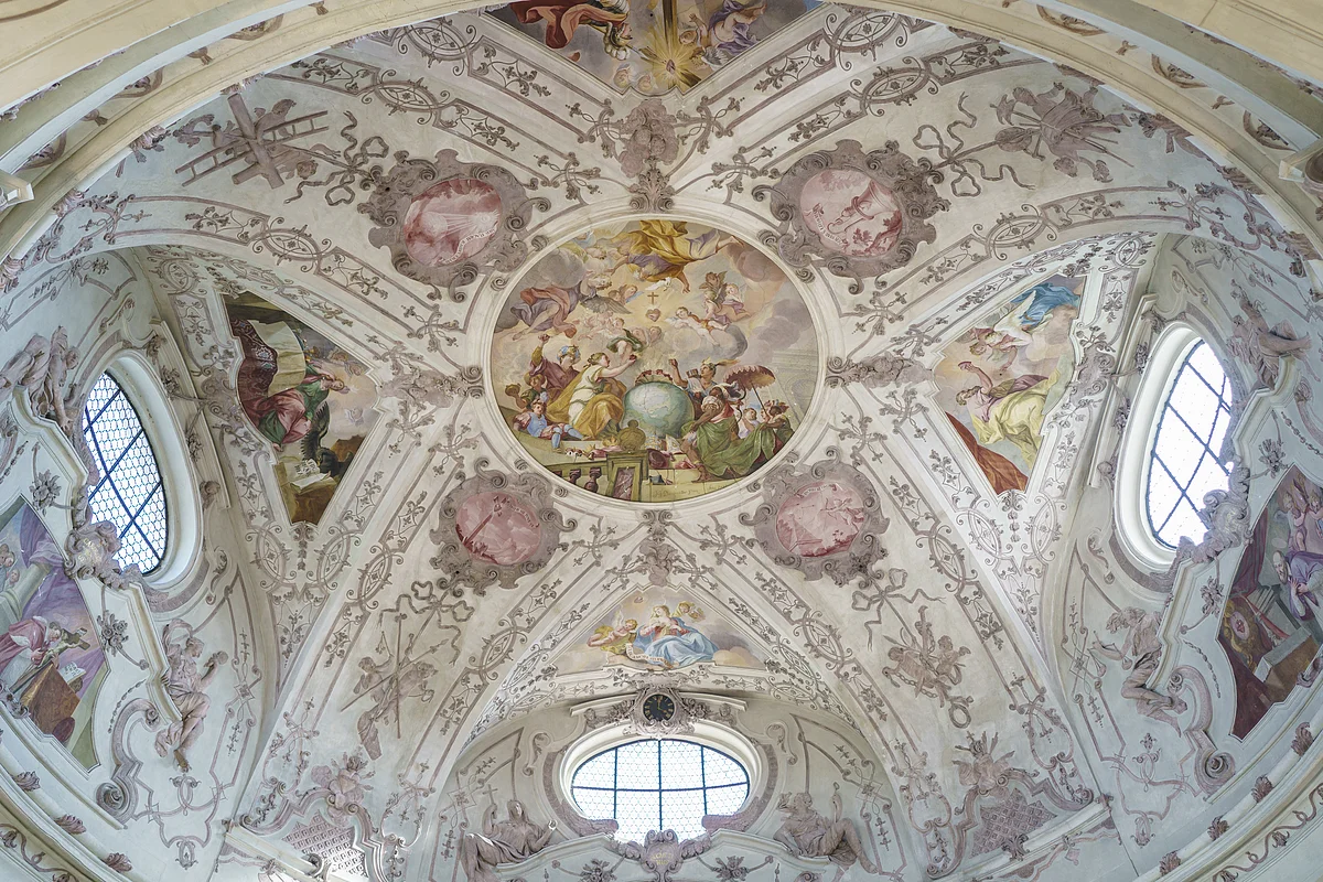 Für den Stuck im Frührokokostil, dessen Intensität sich nach oben hin steigert, wird Donato Polli verantwortlich gemacht. Er besteht überwiegend aus dünnem Bandwerk mit Akanthusranken und Blüten, aber auch aus figürlichen Teilen. Den Fresken Bergmüllers werden relativ kleine Flächen zugewiesen. Im Sinne der italienischen Tradition des "quadro riportato" öffnet sich in ihnen eine eigene Himmelswelt, die die reale Architektur ersetzt. Das Bildprogramm ist dem Herzen Jesu gewidmet, einem neuen Kult, der popularisiert werden sollte.