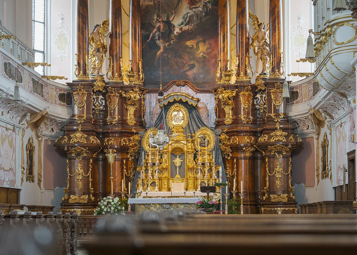Eine einheitliche theologische Idee - das Wirken der Engel im Heilsgeschehen - bestimmt Ausgestaltung und Ausstattung des Kircheninneren. Zur Entfaltung dieses Programms werden nicht weniger als 567 Engelsdarstellungen in Holzplastik, Stuck, Öl- und Freskomalerei verwendet. Höhepunkt dieser theologischen Aussage ist der Hochaltar, ein Meisterwerk des Eichstätter Hofbildhauers Matthias Seybold (Entwurf und Figuren) aus dem Jahre 1739; das große Altarbild, in dessen Mittelpunkt der Kampf Michaels mit Luzifer steht, ist eine hervorragende Schöpfung von Johann Evangelist Holzer, einem der begabtesten Maler des deutschen Barocks. Die 1733 errichteten vorderen Seitenaltäre mit bewegten Engelgruppen in der Bekrönung wurden wie der Hochaltar von Matthias Seybold entworfen und mit Figuren ausgestattet, die Altarblätter stammen vom Augsburger Maler Johann Georg Bergmüller, dem Lehrer Holzers. Das warme Braungold der Altäre bildet mit dem Weiß des von Franz Gabrieli geschaffenen Stucks und dem Morellenrot des Stuckuntergrundes eine vollendete Harmonie. Dem Wirken der Engel gewidmet sind auch die Deckenfresken, die Johann Michael Rosner aus Worms 1717 malte, und die Kanzel, eine ausgezeichnete Schöpfung (1721) der Jesuitenfratres Johann Veit (Entwurf und Schreinerarbeit) und Franz Steinhart (Figuren und Ornament).