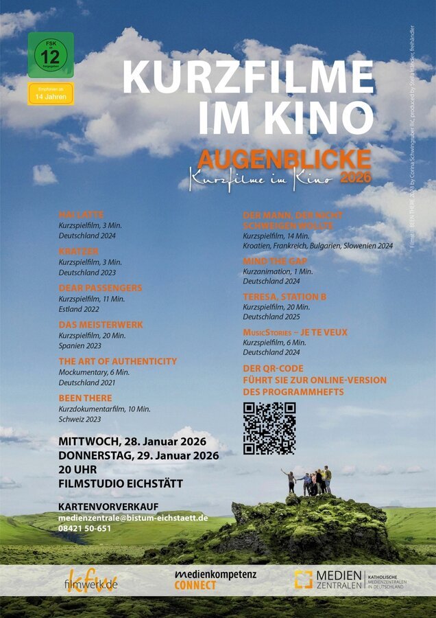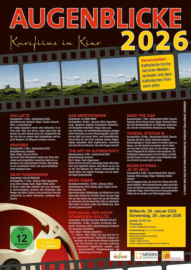 „AugenBlicke – Kurzfilme im Kino“ Seit 33 Jahren präsentiert das kirchliche Projekt inhaltlich und ästhetisch anspruchsvolle Kurzfilme auf der Kinoleinwand – Geschichten, die herausfordern, Bilder, die unsere Wahrnehmung verblüffen, Filme, die zur Auseinandersetzung und zum Gespräch anregen.