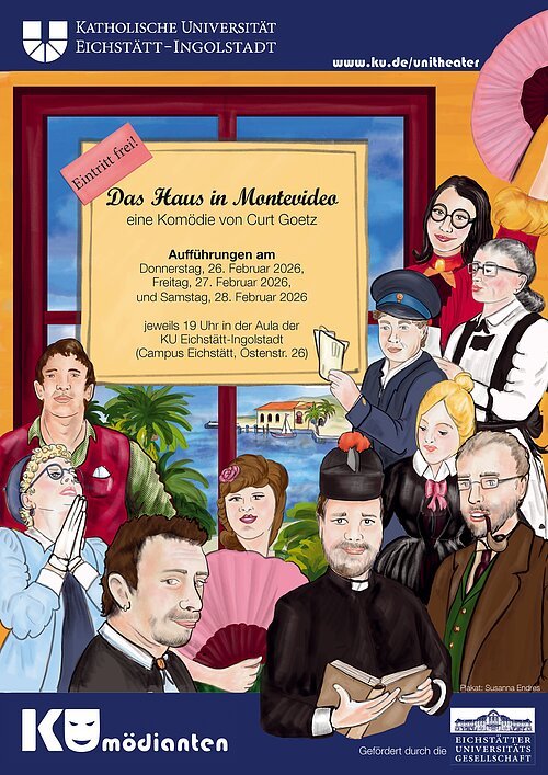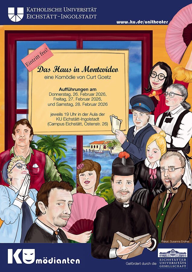 Die KUmödianten, die Theatergruppe der Katholischen Universität Eichstätt-Ingolstadt, bringen im Februar die Komödie "Das Haus in Montevideo - oder Traugotts Versuchung" von Curt Goetz auf die Bühne der Aula am Campus. Die Zuschauer erwartet eine Komödie voller feinem Humor über Anstand, Toleranz und die Frage, wie belastbar unsere Prinzipien wirklich sind… Weitere Informationen im Programmheft, auf der Website der KUmödianten: https://www.ku.de/unileben/kunst-und-kultur/kumoedianten/aktuelle-produktion