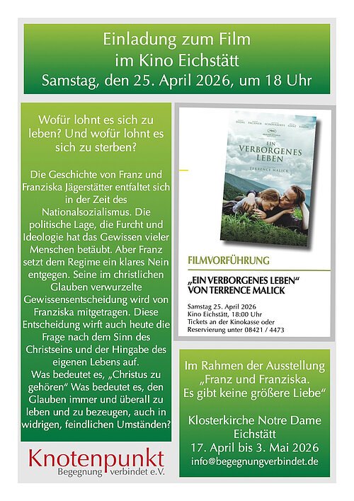 Ein Bauer, Ehemann und Vater entscheidet im Namen seines vom christlichen Glauben geprägten Gewissens, dem Nationalsozialismus ein klares "Nein" entgegenzusetzen und bezahlt dafür mit seinem Leben. Seine Ehefrau trägt die Entscheidung mit. Die beiden haben drei kleine Töchter. Es geht um Franz und Franziska Jägerstätter, deren Geschichte mittels ihrer Briefe und durch Aussagen von Zeitgenossen in dieser Ausstellung durch Texte, Photos und Videos erzählt wird. Franz und Franziska sprechen noch heute zu uns. Ihre im Glauben gründende Liebe macht sie bereit, ihr Leben für die Wahrheit hinzugeben. Das Ehepaar inspirierte Filmregisseur Terrence Malick zu seinem Meisterwerk "Ein verborgenes Leben", der am 25. April um 18 Uhr im Eichstätter Kino gezeigt wird.
