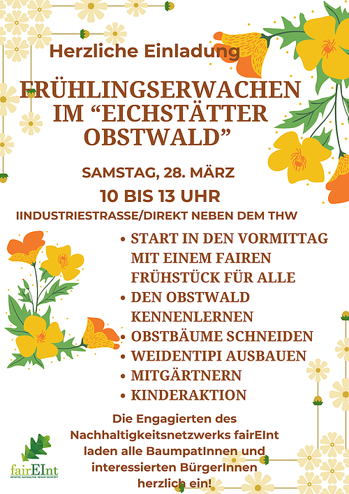 Der Frühling kommt in großen Schritte und es ist wieder Zeit, den öffentlichen "Eichstätter Obstwald" in der Industriestraße frühlings- und sommerfest zu machen. Das Team des Nachhaltigkeitsnetzwerks fairEInt lädt daher alle Interessierten und alle BürgerInnen, die den "EIchstätter Obstwald" noch nicht kennen, ganz herzlich zu einem