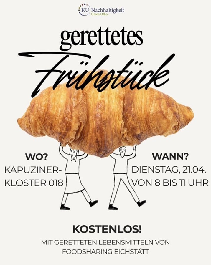 In Kooperation mit Foodsharing organisiert das Greenoffice der KU am Dienstag von 8 bis 11 Uhr ein Frühstück mit zum Teil geretteten Lebensmitteln (Raum KAP-018 an der KU); selbstverständlich kostenlos