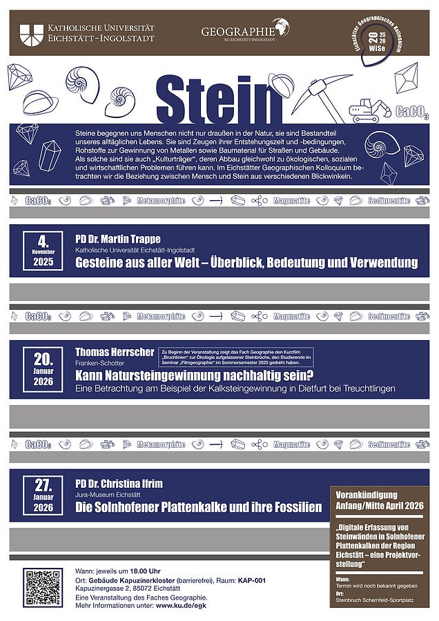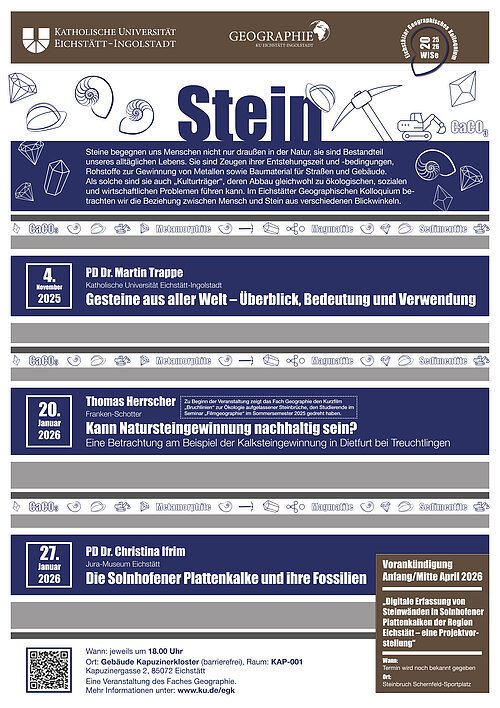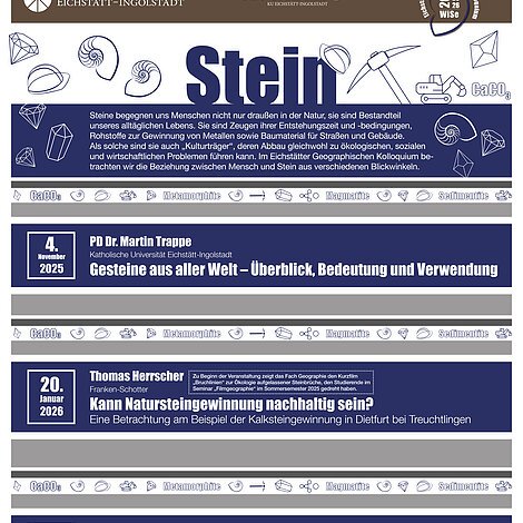 Steine begegnen uns Menschen nicht nur draußen in der Natur, sie sind Bestandteil unseres alltäglichen Lebens. Sie sind Zeugen ihrer Entstehungszeit und -bedingungen, Rohstoffe zur Gewinnung von Metallen sowie Baumaterial für Straßen und Gebäude. Als solche sind sie auch „Kulturträger“, deren Abbau gleichwohl zu ökologischen, sozialen und wirtschaftlichen Problemen führen kann. Im Eichstätter Geographischen Kolloquium betrachten wir die Beziehung zwischen Mensch und Stein aus verschiedenen Blickwinkeln.