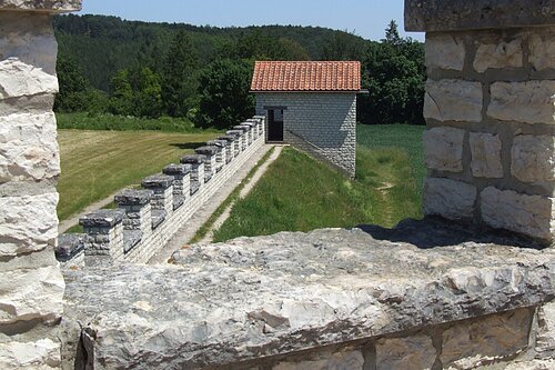 Im Walburgi-Holz am Waldrand, vorbei an einer Kapelle gehts durch den Wald bergauf. Ein Stichweg führt zum Römerkastell Vetoniana. Ein Lehrpfad umrundet das Kastellgelände. Zurück gehen wir links weiter Richtung Pietenfeld. Im weiten Bogen halten wir uns am Waldrand, kommen zum Sendemast und umgehen