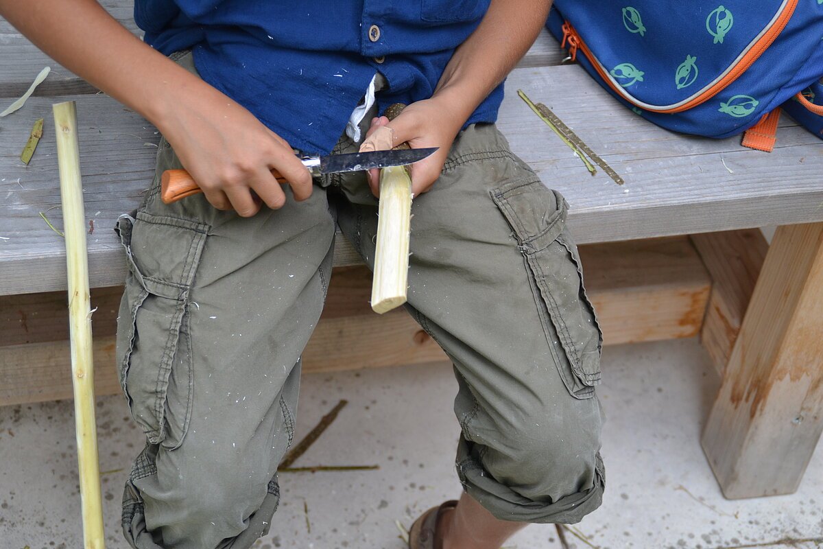 Wenn möglich eigenes geeignetes Schnitzmesser mitbringen, für Kleinere ohne Spitze. Ein Multifunktionsmesser ist nicht gut geeignet. Wir gehen langsam vor. Jedes Kind soll nach seinem Bedürfnis und Fähigkeiten lernen.