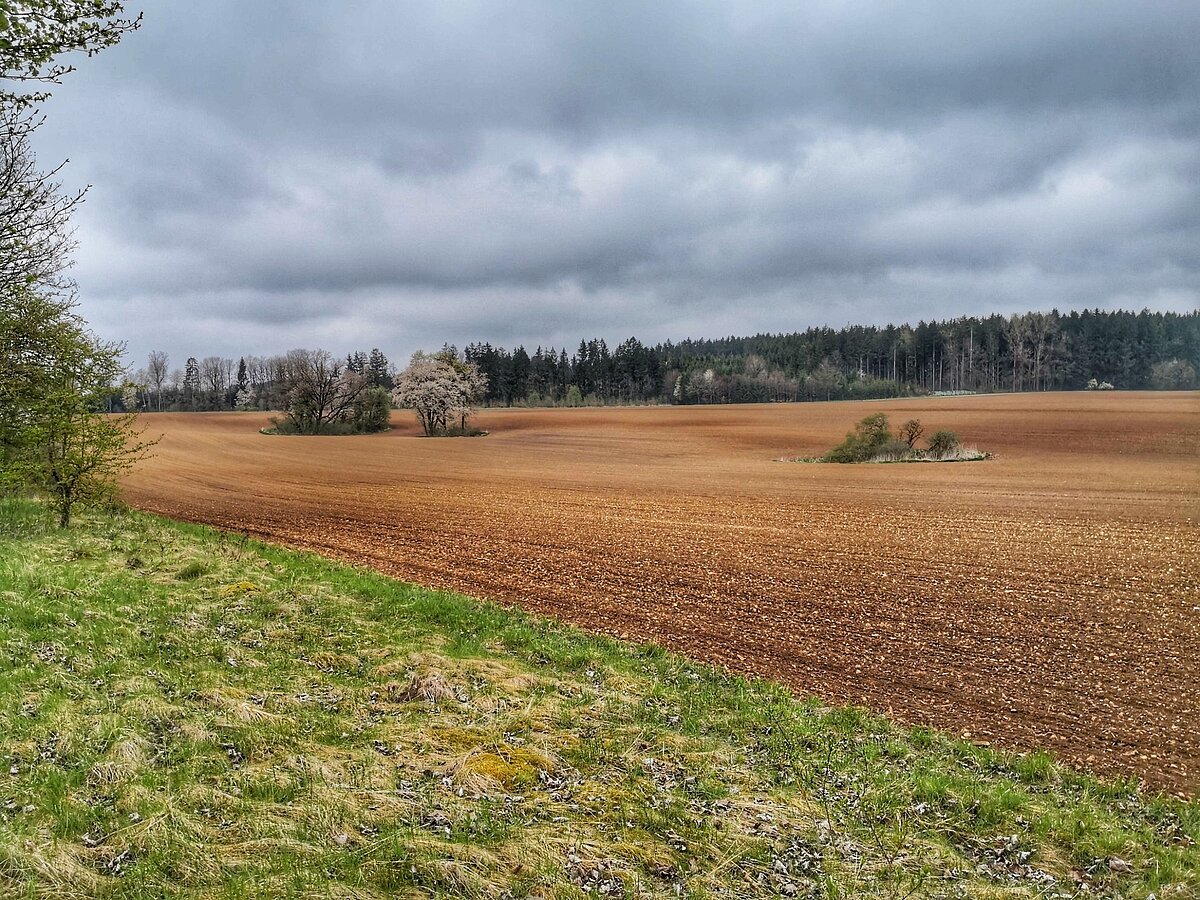 geradeaus an der Hl.-Kreuz-Kirche vorbei nach Langensallach und links nach Sperberslohe. Am Gestüt vorbei zum Geländer. Nach der Überquerung der B13 wandern wir auf dem Chaisenweg und dem Erzweg über den Aussichtsberg.