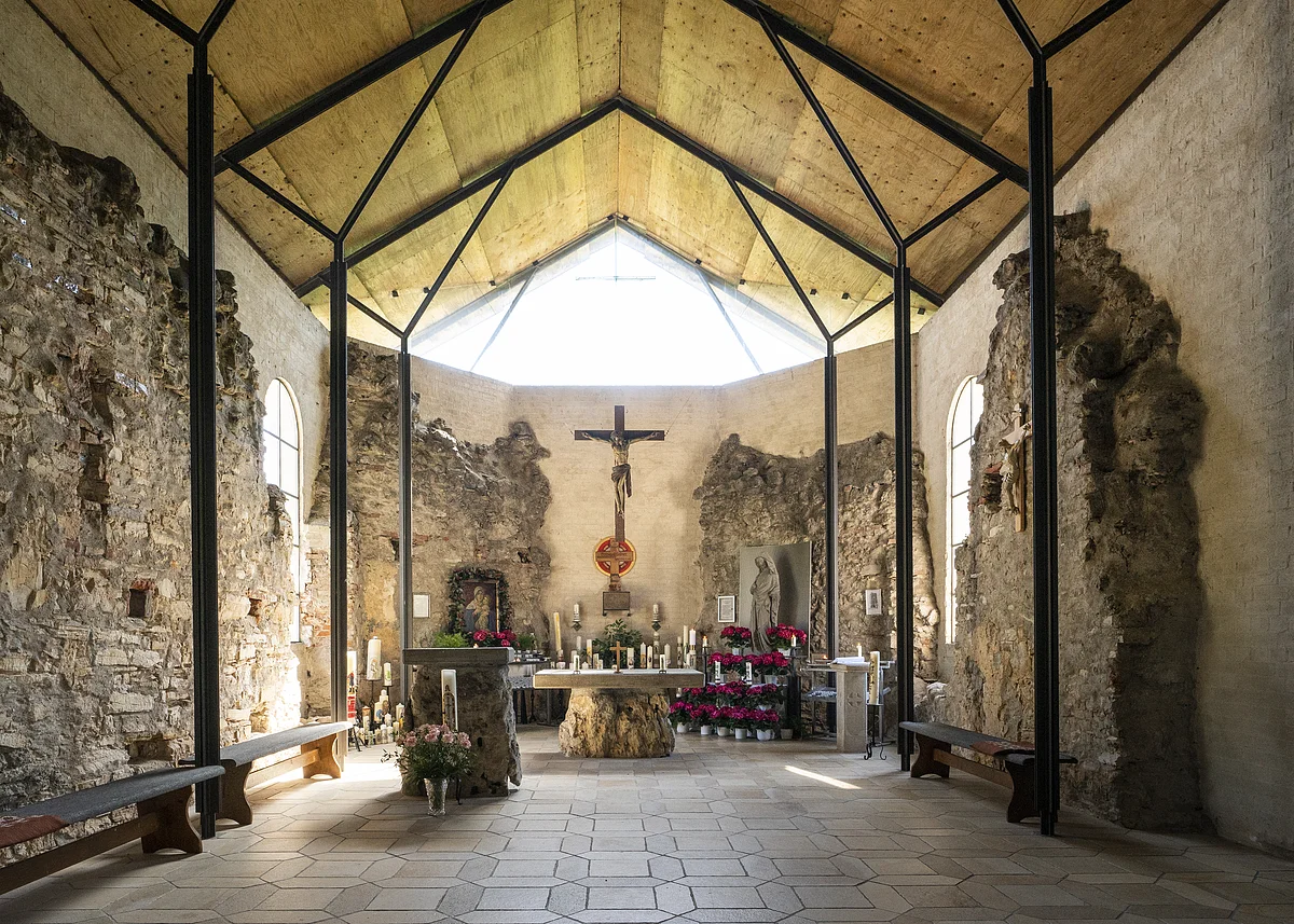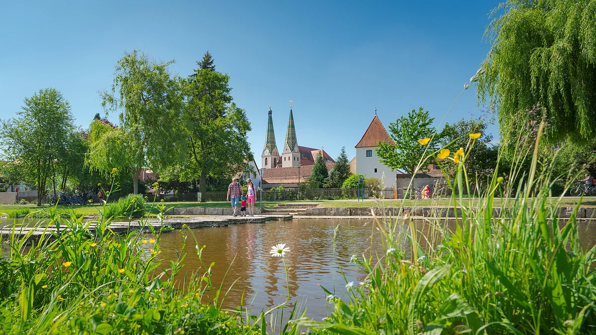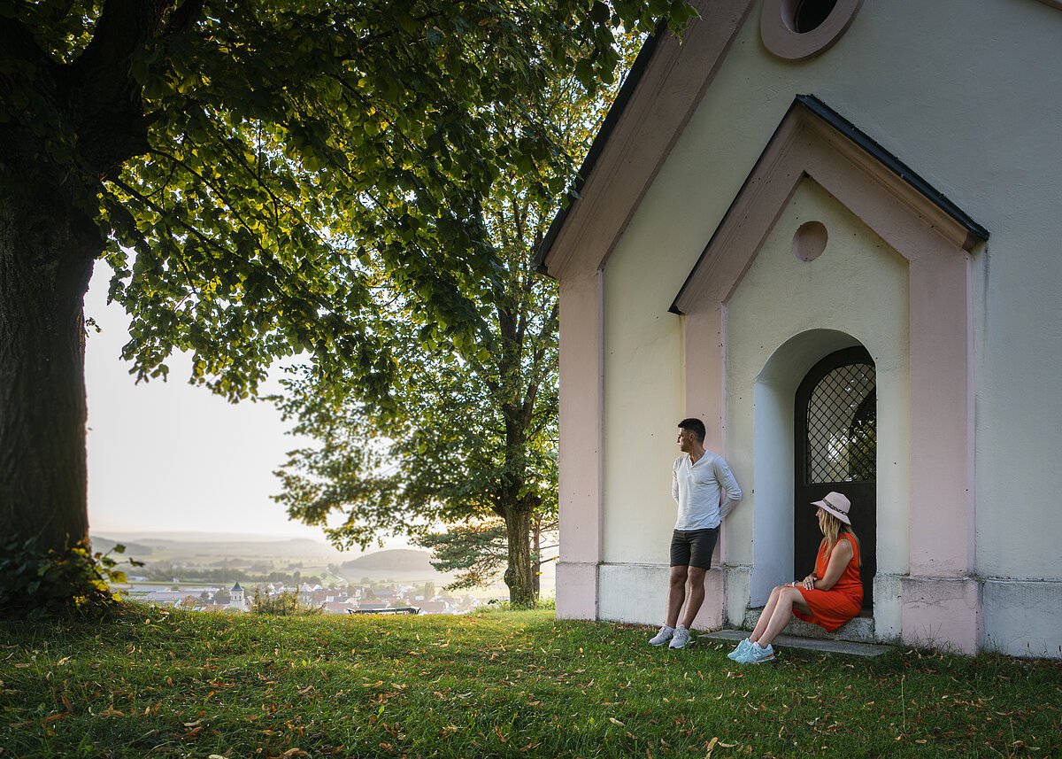 Innenraum einer Kapelle mit Altar, Kreuz, Kerzen und Blumen, umgeben von alten Steinmauern und HolzdeckeZwei Personen mit Rucksäcken stehen in einer barocken Kirche mit verzierten Holzstühlen und bemalter Decke.Wallfahrerweg (Erlingshofen)Ein Wanderer mit roten Rucksack steht an einer Mauer und lässt seinen Blick über Greding schweifen. Die Stadt ist von zwei Bäumen eingerahmt.Park mit Teich, Wiese, Bäumen und Menschen vor historischen Gebäuden mit zwei Türmen bei blauem HimmelWanderer vor der Wallfahrtskirche St. Sebastian Breitenbrunn